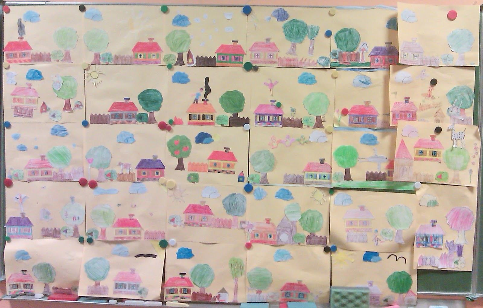 Ćwiczyliśmy liczenie w zakresie 5. Później wykonaliśmy obrazek z gotowych i narysowanych przez siebie elementów "Dom i jego otoczenie".